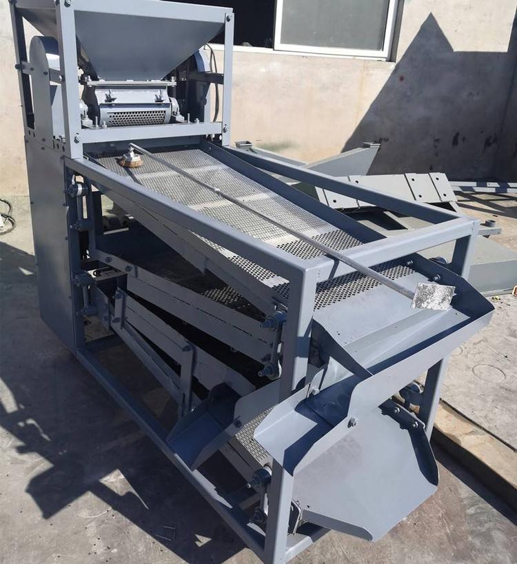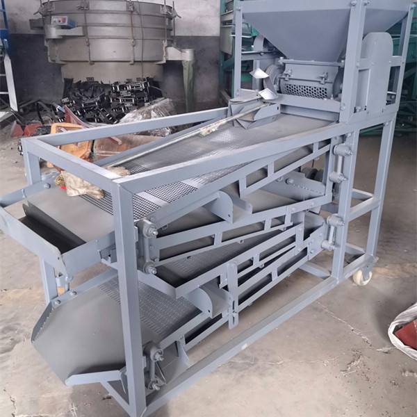 將花椒放入進(jìn)料口---------進(jìn)料口下方有一個分離器將花椒耙籽殼分離開--------分離的混合物料落入回旋篩--------回旋篩分為3層-------一層出料霉花椒、花椒葉、花椒枝-----一層復(fù)式篩網(wǎng)篩的是花椒枝----------二層為花椒枝出料口-------復(fù)式篩網(wǎng)為花椒籽出料口--------花椒籽出來時有風(fēng)機(jī)可以增加花椒籽的凈度。提高花椒凈度---------底層出來的是花椒殼