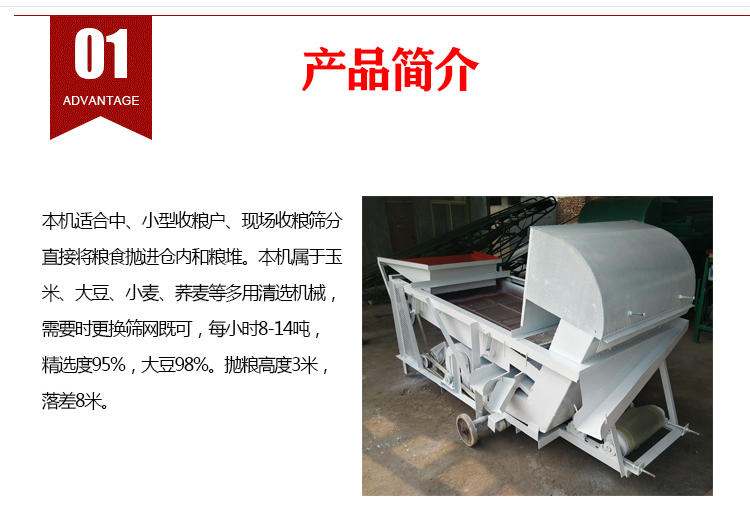 產(chǎn)品描述:玉米風(fēng)選篩分機常用于小麥、水稻、玉米、大豆、棉種及各種油料種子的精選、分級和除雜。適合廣大種糧收糧大戶和飼料加工廠使用。該機篩選大豆和玉米每小時3-5噸,篩選小麥和水